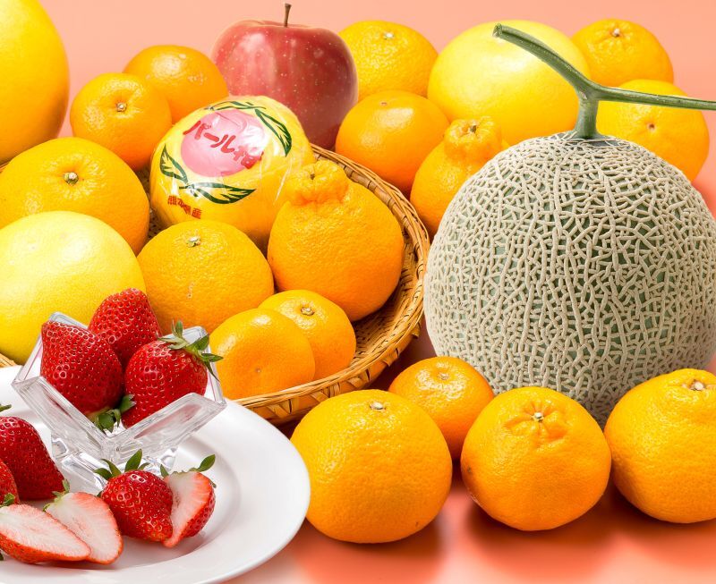 柑橘とマスクメロンを中心に、りんごやいちご等、旬の果物を詰め合わせいたします。内容はすべておまかせとなります。
